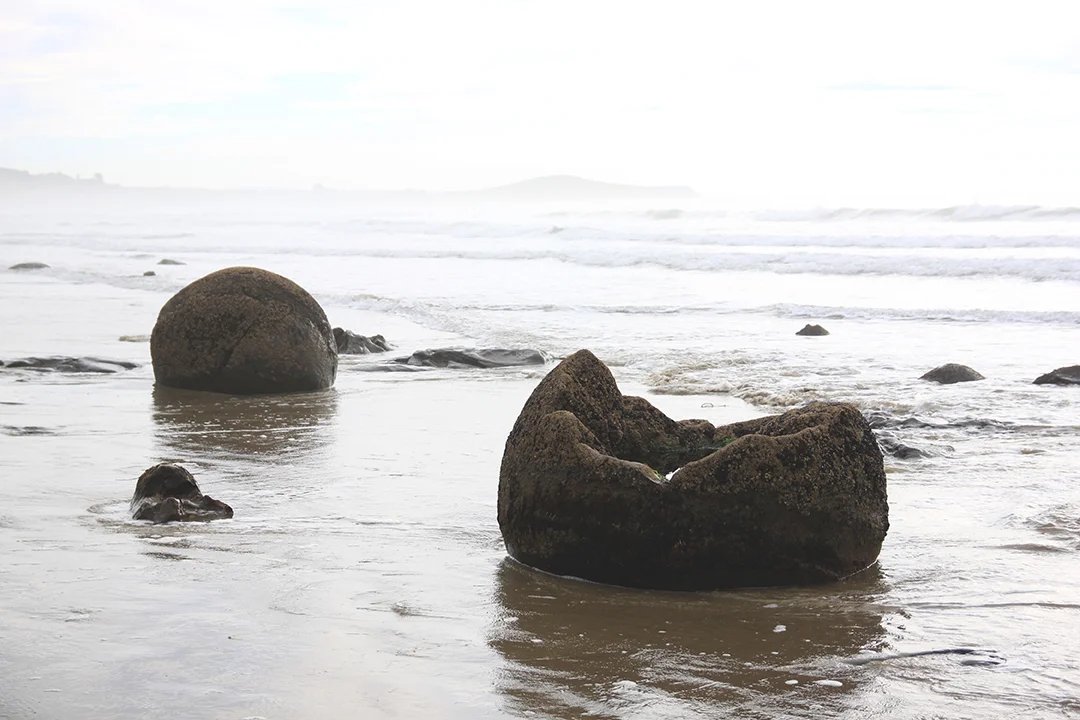 They almost look alive. Perhaps it's because you can see different boulders at different stages of deterioration. Those broken open (aka hatched) lie looking slain as they wait for the ocean to reclaim them. Others lie whole, spherical, somehow taunting the white water with their perfection as it begins to surround them. Original reports are described with many more boulders than there now. As you walk along the beach such a fact doesn't surprise you as, like ruins of a city, fragmented rock lie scattered about, rising just barely above the wet sand, acquiring green blankets of moss as consolation.