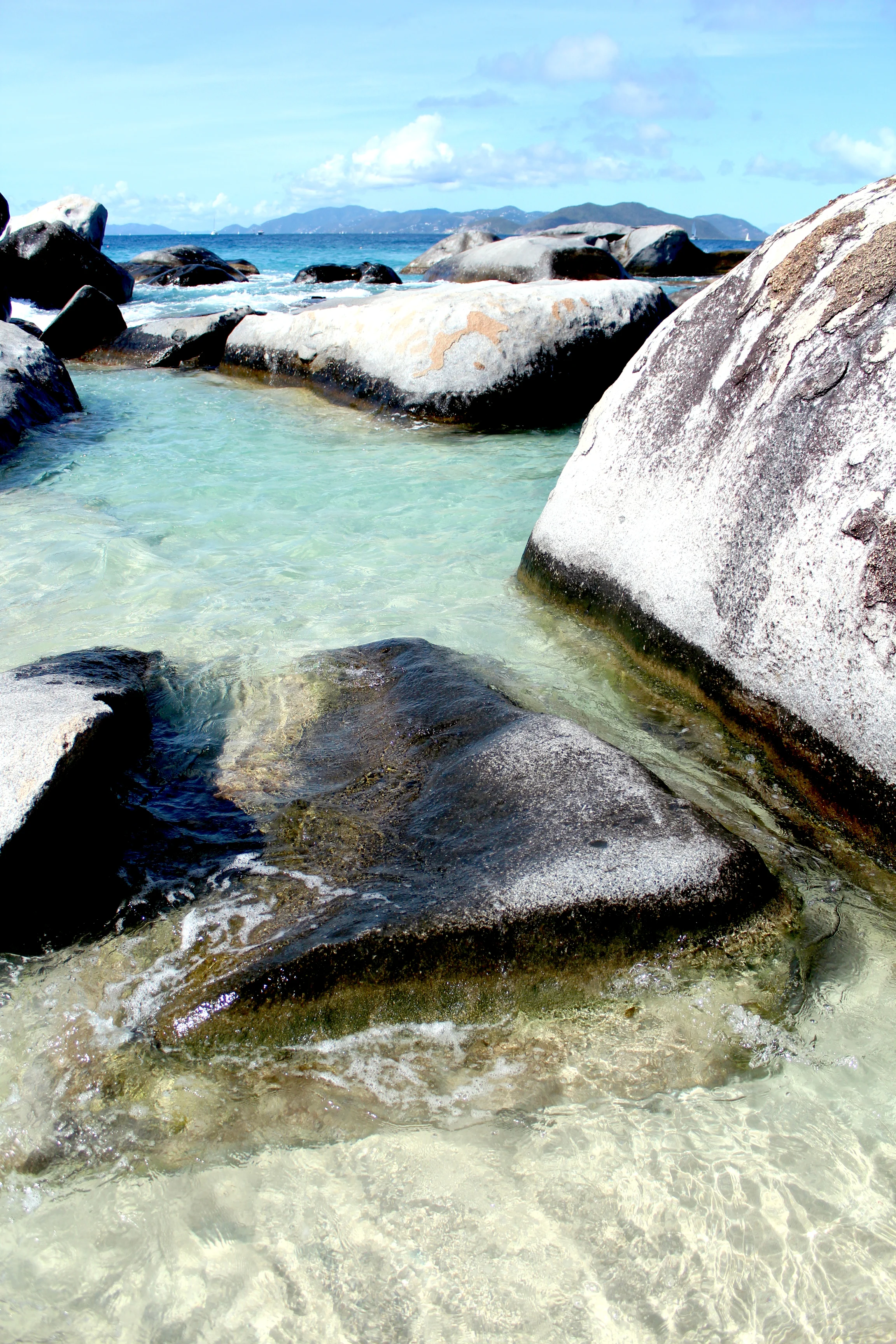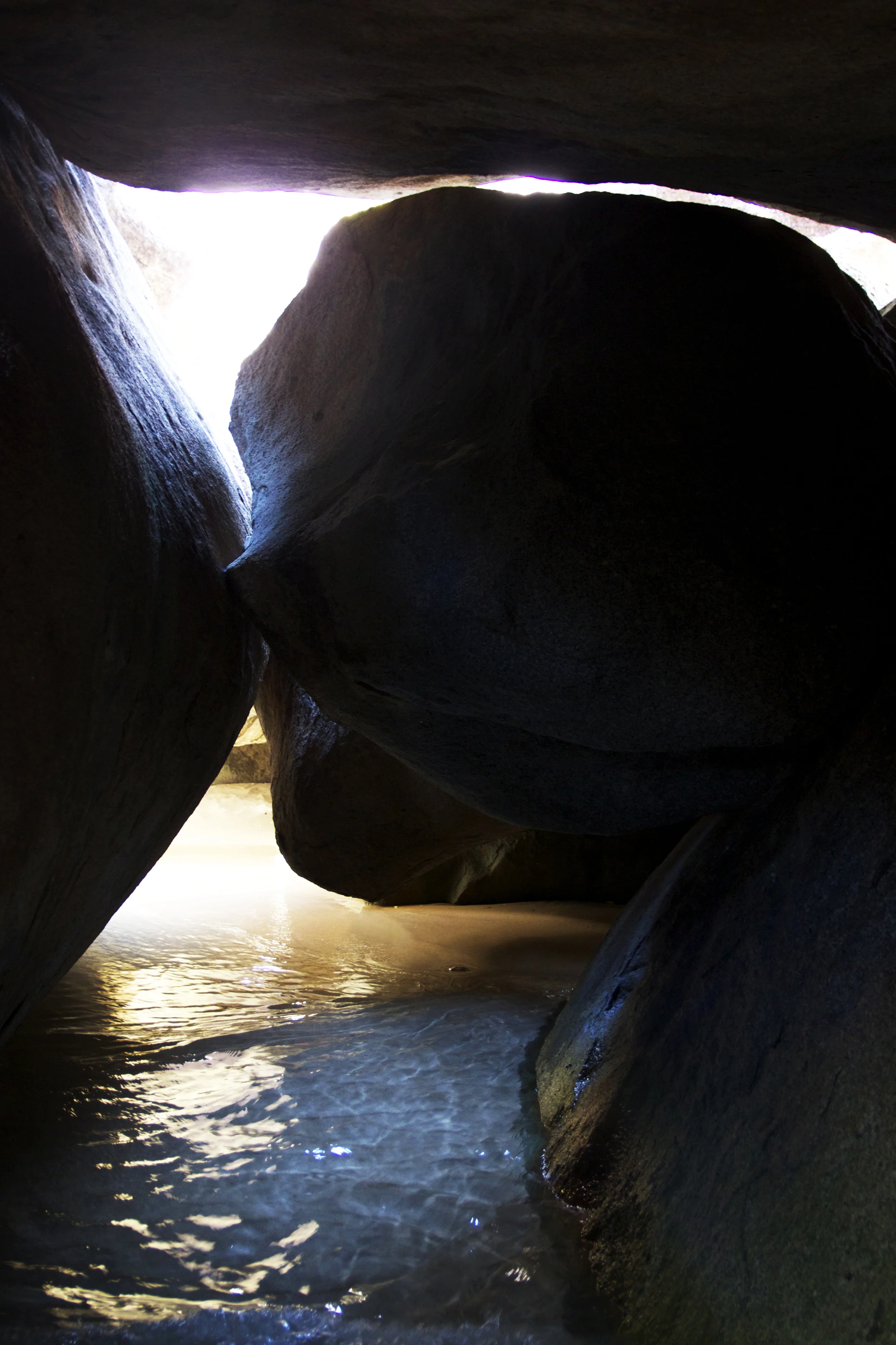 The commercial heart of Virgin Gorda is on the south end, a twenty minute drive from where we stayed. Though not in keeping with our Quiet and Secluded rule, "commercial heart" in this case is a very light term on an eight-square-mile island of four thousand people. We rented a jeep and drove south-ward (on the left side of the road, right side of the car, no less) to the Baths, a beach with a sprinkling of coast-bound boulders and rock formations from the Flinstones era that looked like pebbles dinosaurs played with in their time of inhabiting the Caribbean islands. The descent through the boulders snaked along a path of makeshift wooden ladders and ropes, all while deep-turquoise water splashed about your feet. We crawled through the person-sized cracks and spaces, keeping our cameras held as high as we could, releasing into rock cathedrals of blues and greys and oranges and yellows and greens.